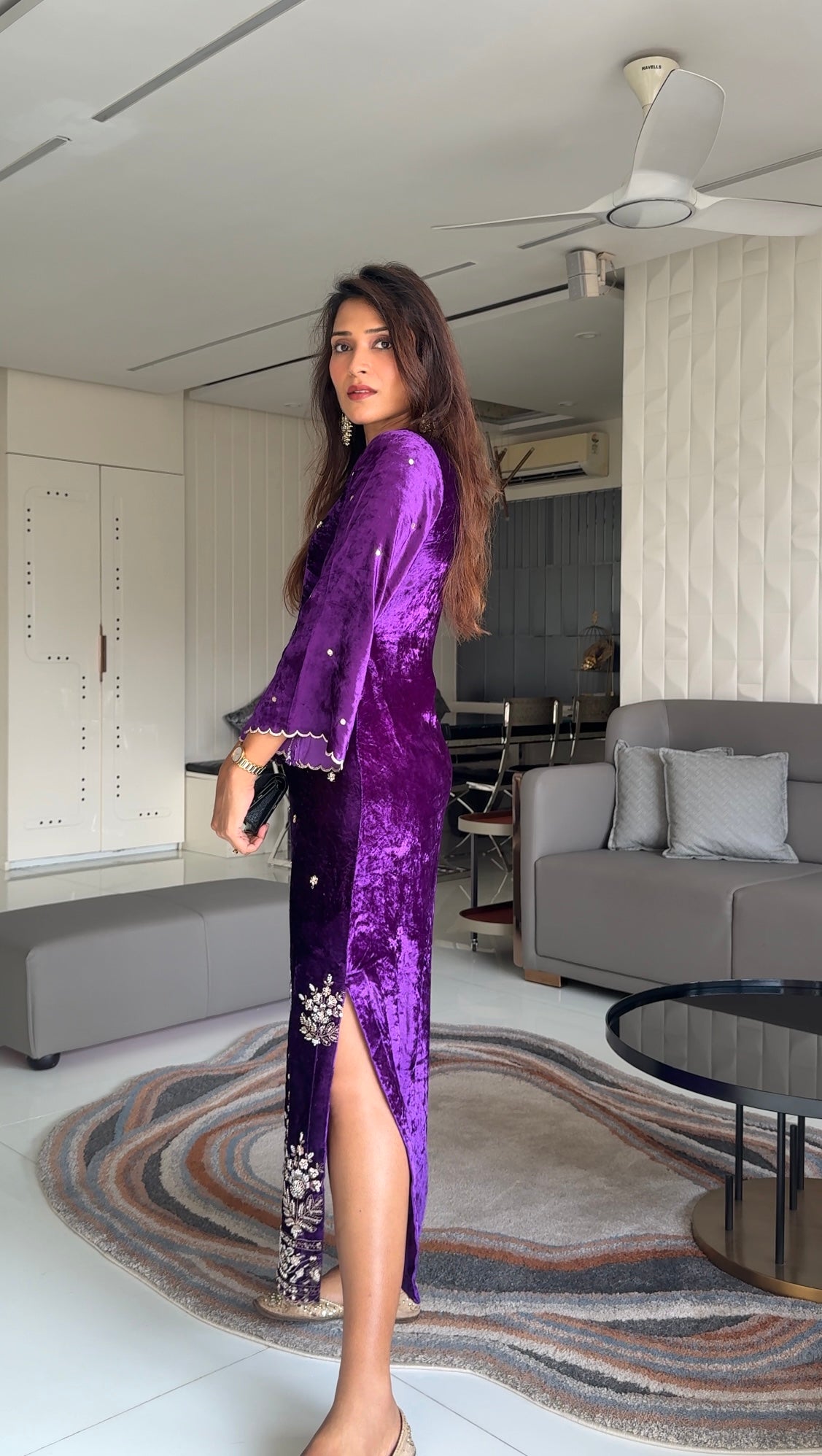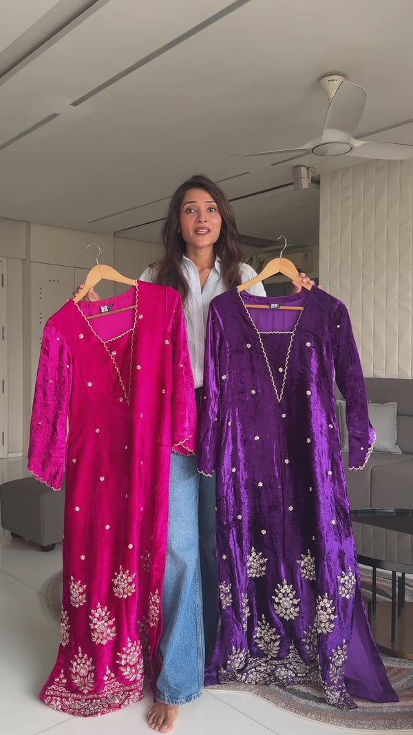 This velvet tunic is crafted from premium imported velvet and features delicate mughal hand-embroidered floral motifs for an elegant festive charm. Designed in a relaxed style silhouette with 3/4th sleeves, it offers effortless grace and comfort. The scalloped edging along the neckline and sleeves adds a refined finish. The rich purple hue elevates its regal appeal, making it perfect for festive gatherings, intimate celebrations, and special occasions.