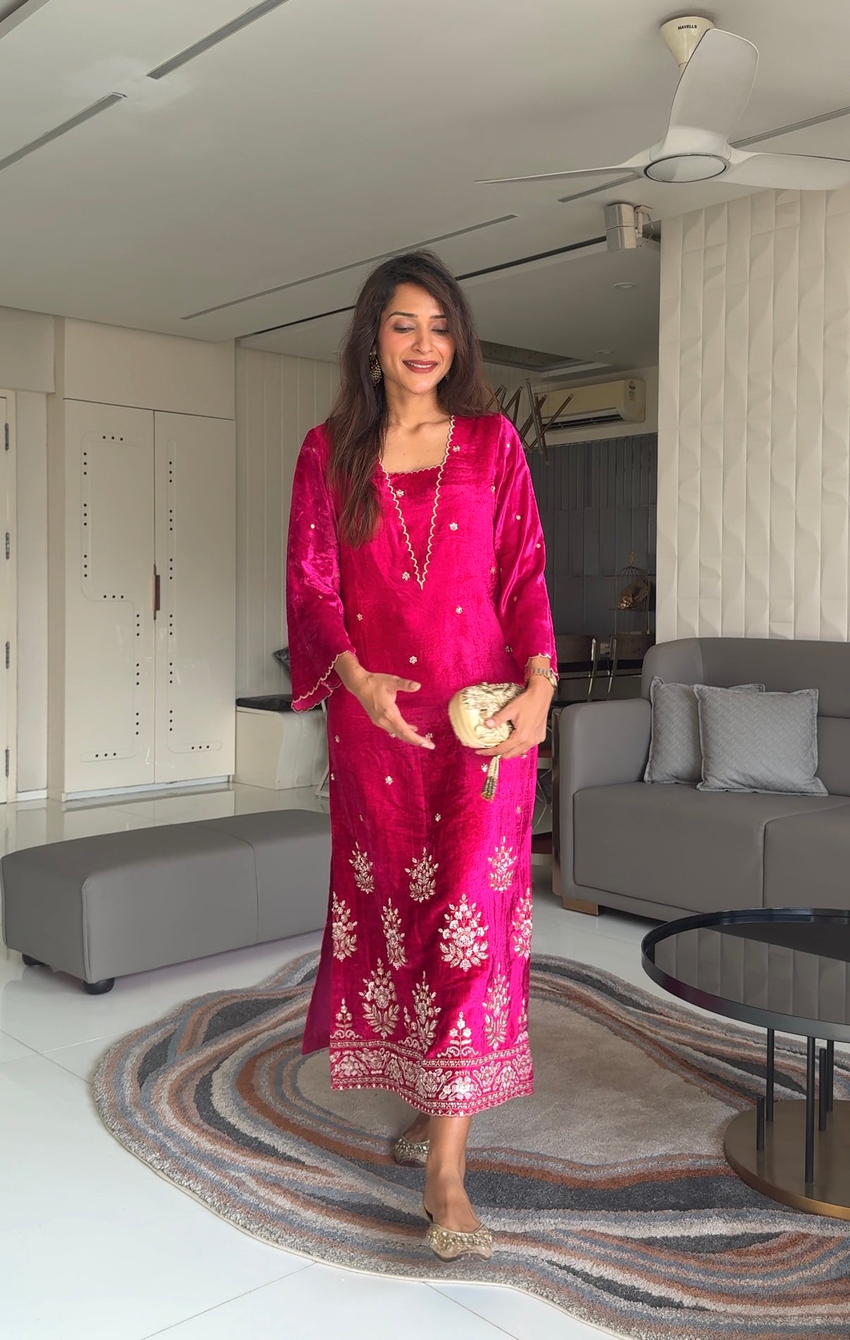 This luxurious velvet tunic is crafted from premium imported velvet satin and adorned with delicate hand-embroidered scattered across the front. The highlight of the piece is the intricately detailed embroidered border and motifs along the hem, adding richness and festive elegance. Designed in a relaxed straight-cut silhouette with soft 3/4th sleeves, the kurta features a scalloped square neckline that enhances its feminine charm. The vibrant rani pink hue brings a regal and radiant touch, making it a perfect choice for festive occasions and celebrations.